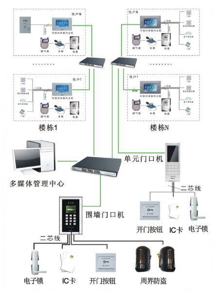 门禁对讲系统是在各单元口安装防盗门,小区总控中心的管理员总机、楼宇出入口的对讲主机、电控锁、闭门器及用户家中的可视对讲分机通过专用网络组成。以实现访客与住户对讲,住户可遥控开启防盗门,各单元梯口访客再通过对讲主机呼叫住户,对方同意后方可进入楼内,从而限制了非法人员进入。